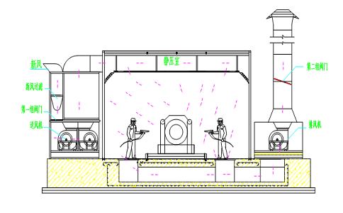 機(jī)車噴烘一體房采用上部送風(fēng),下部排風(fēng)的干式漆霧處理結(jié)構(gòu)。 設(shè)計時嚴(yán)格按照國家有關(guān)安全,衛(wèi)生,消防及環(huán)保等方面的標(biāo)準(zhǔn)要求執(zhí)行,整個設(shè)計以用戶的要求為依據(jù),結(jié)合工件及使用涂料現(xiàn)狀,按照涂裝工藝規(guī)范要求進(jìn)行設(shè)計。