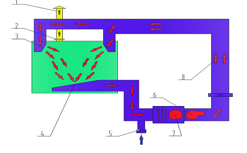 在機(jī)車噴烘一體房地面設(shè)置左、右二道排風(fēng)溝,在風(fēng)溝中安裝有漆霧過濾裝置(原理見漆霧處理方式圖),用以吸附過噴漆霧中的樹脂等固體分。漆霧過濾裝置由過濾纖維托網(wǎng)及過濾纖維棉構(gòu)成,折流過濾纖維棉放置在托網(wǎng)上。