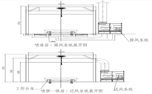 本機(jī)車噴烘一體房用于工件噴漆時捕捉漆霧、處理漆霧,以及油漆烘干、廢氣治理功能,且嚴(yán)格按照國家有關(guān)勞動安全、衛(wèi)生、消防及環(huán)保等方面的標(biāo)準(zhǔn)進(jìn)行設(shè)計,通、排風(fēng)根據(jù)噴漆的工藝要求實(shí)施。