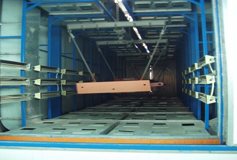 機(jī)車部件結(jié)構(gòu)件噴粉線橋式固化爐技術(shù)說(shuō)明及結(jié)構(gòu):固化爐采用燃?xì)饧訜釤犸L(fēng)循環(huán)方式,其原理為:燃燒機(jī)加熱產(chǎn)生的火焰熱直接輻射到換熱器上,通過(guò)熱風(fēng)循環(huán),在循環(huán)風(fēng)機(jī)的作用下空氣被強(qiáng)制熱循環(huán),通過(guò)風(fēng)管將加熱爐內(nèi)的熱空氣抽出,送入固化烘道內(nèi),使固化爐內(nèi)的溫度更均勻。