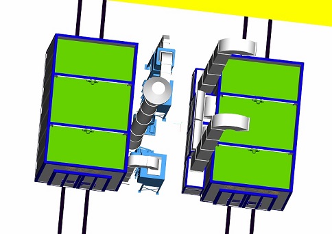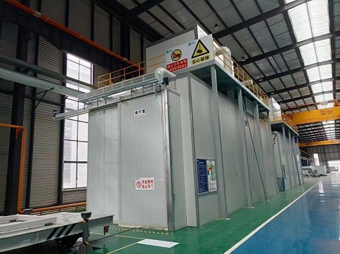 烘干室采用熱風(fēng)循環(huán)燃?xì)忾g接加熱的方式進(jìn)行。通過循環(huán)風(fēng)機(jī)及管道,加熱后的空氣進(jìn)入烘干室內(nèi)與工件進(jìn)行熱交換,實(shí)現(xiàn)對工件的升溫加熱,換熱后的空氣由回風(fēng)管收集,與補(bǔ)充的新鮮空氣一起返回到加熱室,形成內(nèi)循環(huán)。經(jīng)過重復(fù)的循環(huán),從而使工件表面溫度升至規(guī)定溫度。當(dāng)溫度達(dá)到設(shè)定值時,加熱器自動停止工作