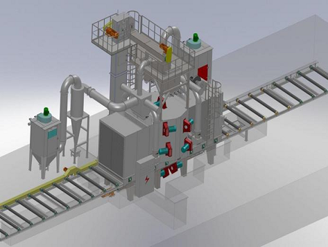 輥道通過式拋丸機(jī)主要由拋丸清理室、清掃室、前后密封室、拋丸器總成、室體輥道、前后輸送輥道、滾掃及吹掃系統(tǒng)、氣動供丸系統(tǒng)、分離器、提升機(jī)、螺旋輸送器、平臺梯子、除塵系統(tǒng)、電器控制系統(tǒng)、氣控系統(tǒng)等