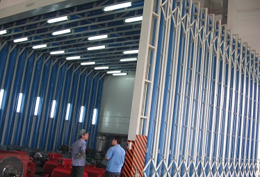采用工業(yè)型材制成,是驅(qū)動電機直接帶動的部分,整個伸縮機構(gòu)穩(wěn)定運動的關(guān)鍵所在。大門框架上設(shè)置有開關(guān)按鈕并行程開關(guān),用以自動控制大門的伸縮 | 除去門框,其余部位就是帆布支撐網(wǎng),是阻燃帆布安裝連接的骨架,由多組型材骨架構(gòu)成,并通過剪式伸縮機構(gòu)將整個相對獨立的骨架連接在一起,形成一個穩(wěn)定的整體 | 在每兩個帆布支撐網(wǎng)之間,采用剪式伸縮機構(gòu)相連,其結(jié)構(gòu)尺寸決定了伸縮量,同時為了保證上下都能同時實現(xiàn)伸縮動作,在每側(cè)上下各布置一套剪式伸縮機構(gòu),兩者之間通過連桿形成一個同步運動機構(gòu) | 在整個網(wǎng)架之間采用工業(yè)阻燃PVC帆布,這是形成相對封閉作業(yè)間的“墻板”,也是保證空氣有序流動的“房體”。安裝時每兩個支撐網(wǎng)采用一塊工業(yè)帆布 | 驅(qū)動部分采用減速電機,傳動到多節(jié)長軸上,再由長軸兩端鏈輪同步傳動到兩側(cè)主動輪上。整個驅(qū)動前進、后退采用三級保護:雙向兩級行程保護軌道終端設(shè)置限位車擋;門柱兩邊有控制盒,操作方便;噴室頂部設(shè)有運行警示燈。減速器選用東方傳動的K系列:斜齒輪-螺旋錐齒輪減速器 |