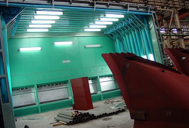 照明系統(tǒng)室內(nèi)設(shè)置上、下兩排照明裝置。頂側(cè)燈組呈45o角安裝,布置方式為:2支×40W×2側(cè);腰側(cè)燈組間隔安裝于墻板內(nèi),布置方式為:2支×40W×2行。所有燈箱均采用δ1.2鍍鋅板制作,并噴白漆美觀大方,又可防止銹跡象產(chǎn)生。燈管采用隔爆型飛利浦高效光源,既安全又節(jié)能且維護方便,鎮(zhèn)流器采用噴漆室專用電子鎮(zhèn)流器,從而保證每個噴漆室體光強≥800Lux,滿足工件各端面的噴涂作業(yè)。燈箱與壁板用小角鐵相連,同時燈箱上安有可拆框架,便于維護。 | ![]() |