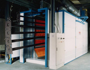 室體主材料 烘道骨架的立柱、橫梁采用□120×120×5方管制作,檁條采用□50×50×4矩形鋼管,均做防腐處理,具有保溫性能好、支撐剛度高的特點;內(nèi)壁板材料采用厚度為δ1.5mm的鍍鋅鋼板,外壁板采用厚度為δ0.80mm的波紋彩鋼板,中間填充δ200mm厚的巖棉夾芯(巖棉密度為120公斤/立方米)保溫板,室體包邊包角材料為δ1.5mm冷板,保溫性能強,使外壁板溫度不高于室溫5℃。 | 鋼結(jié)構(gòu)平臺 采用14#槽鋼拼焊而成,臺面鋪設δ4mm花紋板,設計在烘干室上方,直接通過立柱與地面相連,即烘干室本身不承載鋼結(jié)構(gòu)平臺,兩者是隔開的。在鋼結(jié)構(gòu)平臺上安裝熱風循環(huán)加熱系統(tǒng)。為便于操作人員檢修,在平臺一側(cè)設置有鋼爬梯,四周設置有安全防護欄桿,爬梯、欄桿均按國家標準設計制作。 | 電動提升門 天然氣紅外線輻射烤漆烘干房選用國際新型卷簾門,保溫作用好、抗彎性強,防止冷凝水出現(xiàn);型材表面為多層烤漆或薄膜層,具有優(yōu)良的抗劃傷性能,抗腐蝕、不腐化、耐磨、抗敲打、抗撞擊;在啟動運行過程中,快捷且無噪音(速度可達約0.1m/s,噪音小于58分貝) |