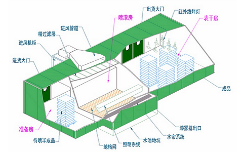 烘干室:熱風(fēng)循環(huán),溫度均勻穩(wěn)定,溫差小,烘干質(zhì)量好;熱源有燃?xì)?、燃油、電加熱;烘干溫?0-200℃;室體采用100mm厚巖棉保溫板;烘干溫度可調(diào)。