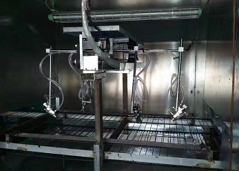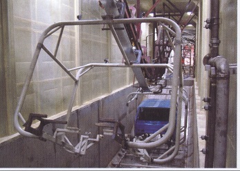 噴漆涂裝線以塑料件工藝為代表,前處理大多采用噴射式處理方式(部分金屬件采用浸漬式或噴射與浸漬結(jié)合方式),其主要目的是通過化學(xué)液體(硫酸、硝酸)以浸泡或噴射的方式,與工件表面的氧化物、油脂等產(chǎn)生化學(xué)反映來達(dá)到除油、脫脂、水洗、純水洗的目的。表面涂料為防腐油漆、色漆、清漆等裝飾性油漆材料,并且考慮塑料件高溫變形,一般采用的油漆成膜溫度為50至80℃左右,輸送系統(tǒng)前處理一般采用輕型懸掛鏈和輸送帶、網(wǎng)鏈送設(shè)備,前處理后轉(zhuǎn)線一般采用地鏈滑撬、懸掛輸送鏈等輸送方式。具體需要根據(jù)工件情況決定。其主要決定因素:工件大小、形狀、重量、材質(zhì)等。